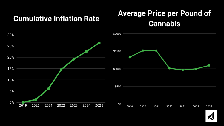 Because cannabis is a regulated product with strict expiration dates, operators must not only produce efficiently but also turn product quickly. The reality is that many overproduce which forces them to slash prices just to get product onto shelves. This cycle of oversupply and discounting has accelerated falling wholesale prices across the U.S. According to Cannabis Benchmarks, the weighted average price for a pound of cannabis dropped from $1,328 in August 2019 to just $1,093 in August 2025—a 17.7% decrease—while inflation rose by 26.36% in the same period.